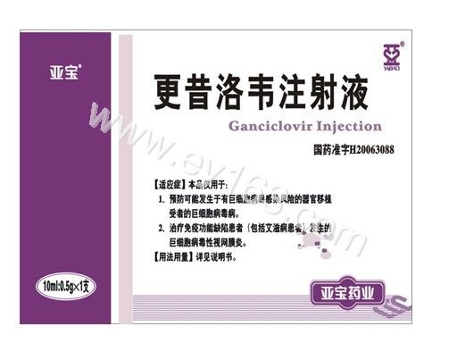 【适应症】1.适用于免疫缺陷患者(包括艾滋病患者)并发巨细胞病毒视网膜炎的诱导期和维持期治疗。 2.亦可用于接受器官移植的患者预防巨细胞病毒感染及用于巨细胞病毒血清试验阳性的艾滋病患者预防发生巨细胞病毒疾病。