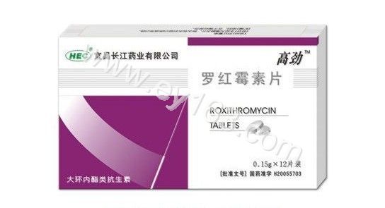 【药代动力学】口服吸收好,血药峰浓度(Cmax)高,单剂量口服罗红霉素150mg后约2小时达血药峰浓度(Cmax)为6.6~7.9mg/L,进食可使生物利用度下降约一半。分布广,扁桃体、鼻窦、中耳、肺、痰、前列腺及其他泌尿生殖道组织中的药物浓度均可达有效治疗水平。其蛋白结合率在血浓度2.5mg/L时为96%。以原形及5个代谢物从体内排出,7.4%自尿液排出。血消除半衰期(t1/2)为8.4~15.5小时。