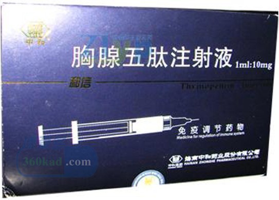 【药理毒理】本品为免疫双向调节药。具有诱导和促进T淋巴细胞及其亚群分化、成熟和活化的功能,调节T淋巴细胞的比例,使CD4+/CD8+趋于正常;调节和增强人体细胞免疫功能的作用,能促进有丝分裂原激活后的外周血中的T淋巴细胞成熟,增加T细胞在各种抗原或致有丝分裂原激活后各种淋巴因子(如:α、γ干扰素、白介素2和白介素3)的分泌,增加T细胞上淋巴因子受体的水平。它同时通过对T辅助细胞的激活作用来增强淋巴细胞反应。此外,本品可能影响NK前体细胞的趋化,该前体细胞在暴露于干扰素后变得更有细胞毒性。因此具有调节和增强人体细胞免疫功能的作用。本品可增强巨噬细胞吞噬功能及增强红细胞免疫功能,提高自然杀伤细胞活性和白介素-2的产生水平与受体表达水平,增强外周血单核细胞γ-干扰素的产生,增强血清中超氧化物歧化酶活性。急性毒性试验:大鼠肌肉注射剂量达44.4mg/kg,小鼠腹腔及静脉给药剂量达300mg/kg;分别为成人用量的2664倍和18000倍,未见动物死亡和毒性反应。长期毒性试验:在为期12个月的长毒试验中,分别对大鼠、狗给予胸腺五肽,最高剂量达80mg/kg/天、未发现有意义的症状体征变化。无论是动物的行为、生长发育、血液学、血液生化学及组织学方面,均未见明显变化。
