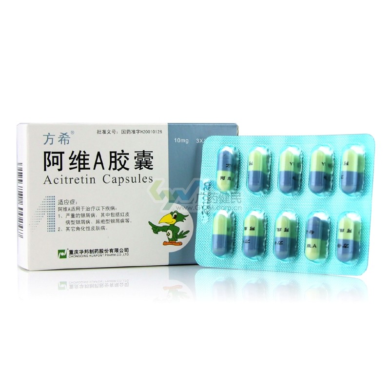 【禁忌】1.孕妇、哺乳期妇女及两年内有生育愿望的妇女禁用。2.对阿维A或其它维甲酸类药物过敏者禁用。3.严重肝肾功能不全者、高脂血症者,维生素A过多症或对维生素A及其代谢物过敏者禁用。