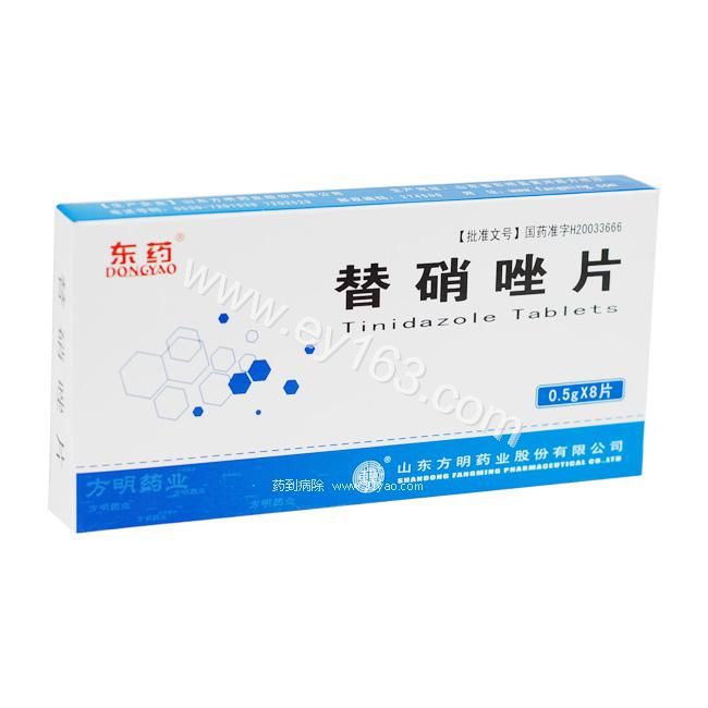 【药代动力学】本品口服后吸收完全,健康女性单剂量口服2g后达峰时间(Tmax)为2小峰浓度(Cmax)为51mg/L。替硝唑排泄缓慢,口服2g后24小时、48小时及72小时血药浓度分别为19.0mg/L、4.2mg/L及1.3mg/L。口服每日给药1g,血药浓度可维持在8mg/L以上。替硝唑在体内的分布广泛,在生殖器官、肠道、腹部肌肉、乳汁中可达较高浓度,在肝脏、脂肪中的浓度低,在胆汁、唾液中的浓度与同期血药浓度相仿,对血脑屏障的穿透性较甲硝唑高,脑膜无炎症时脑脊液中的浓度为同期血药浓度的80%,这与替硝唑的脂溶性较高有关。替硝唑可通过血胎盘屏障,在胎儿及胎盘中可达高浓度。蛋白结合率为12%。在肝脏代谢,单剂量口服0.25g后约16%以原形从尿中排出。血消除半衰期(t1/2)为11.6~13.3小时,平均为12.6小时。